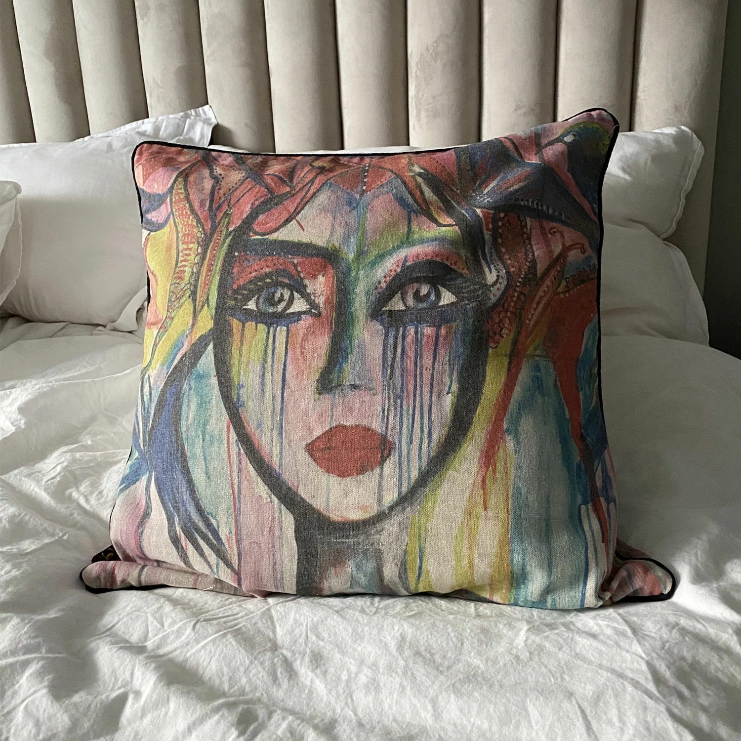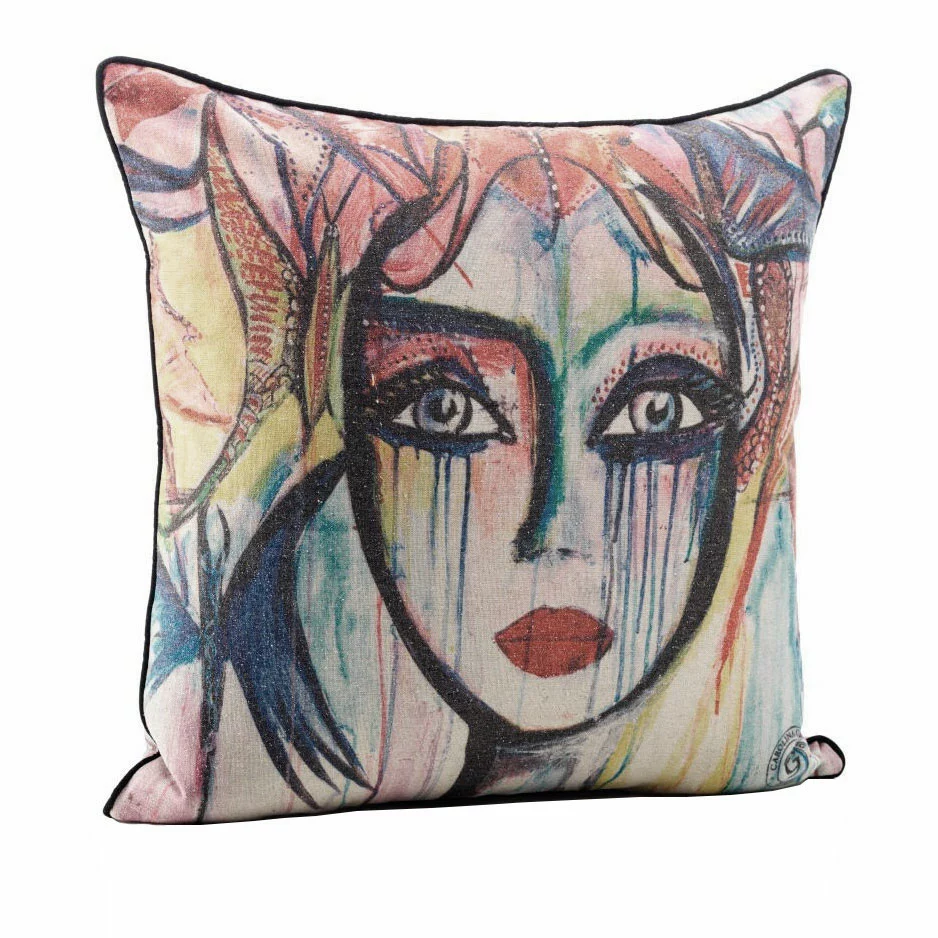 Ein Kopfkissenbezug mit Druck auf beiden Seiten. 50 % Leinen, 50 % Polyester. Handwäsche bei 30 Grad.
